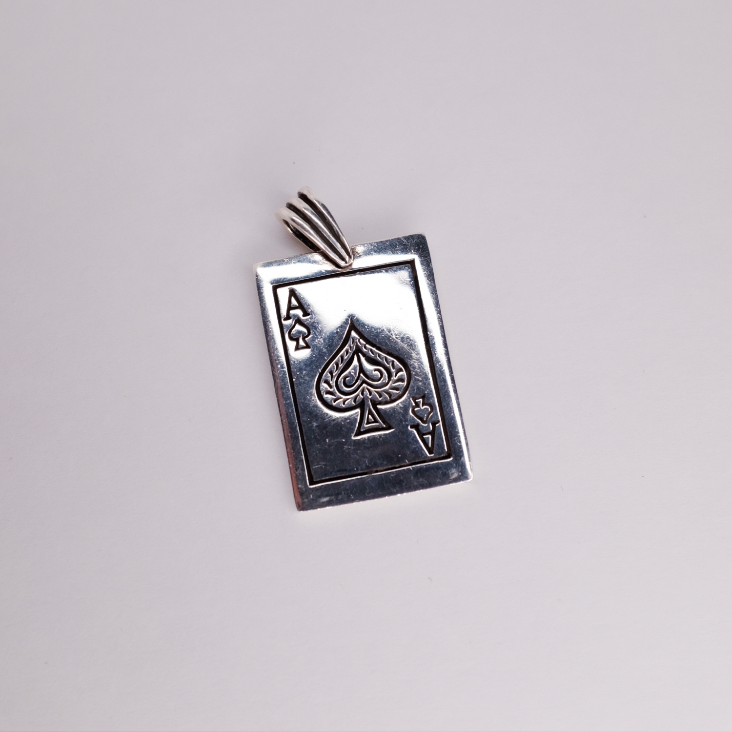 Bold and iconic, this silver pendant features the timeless Ace of Spades design, symbolizing luck, power, and mystery. Its sleek rectangular shape and engraved details give it a modern yet classic appeal. A statement piece for those who appreciate bold style and the thrill of the game.