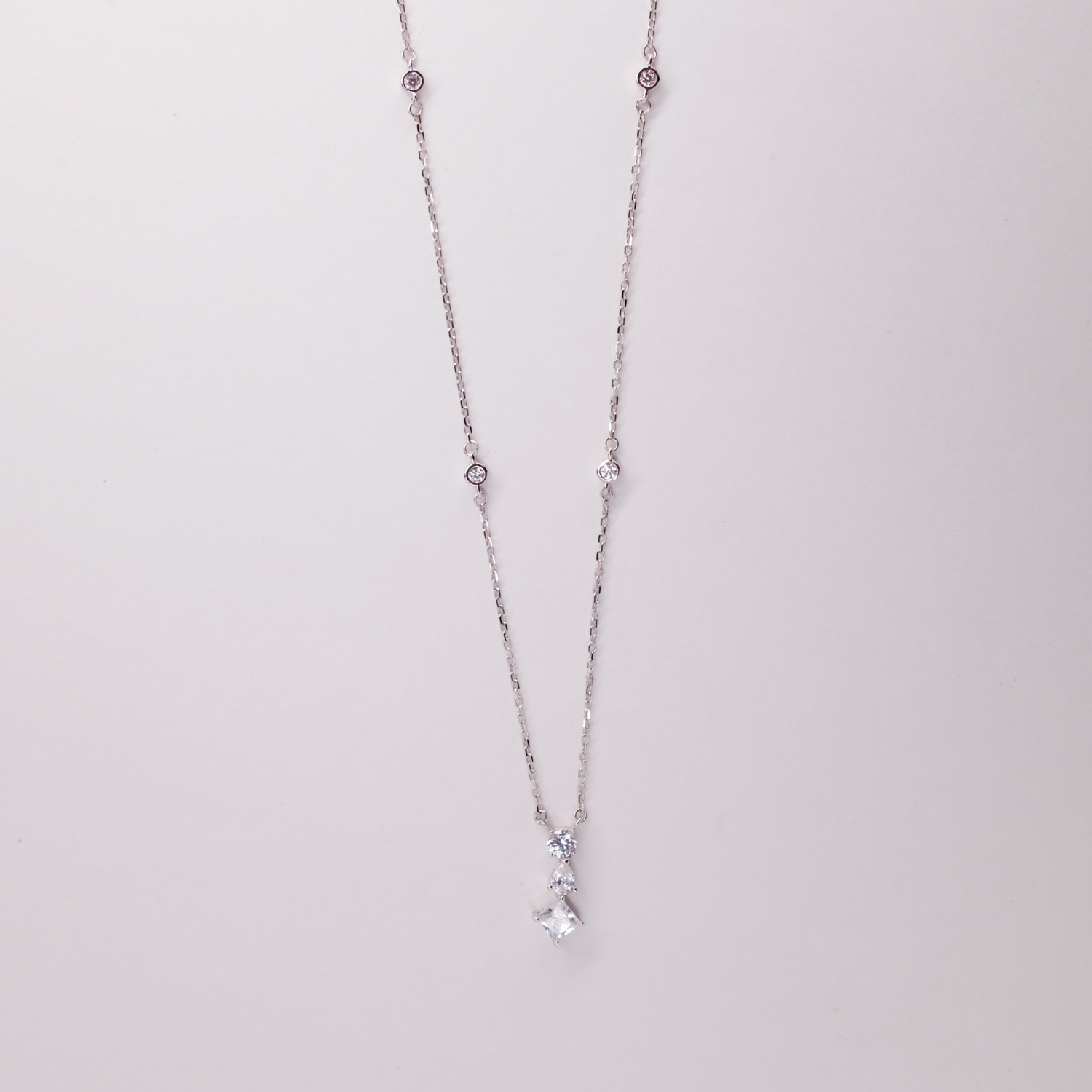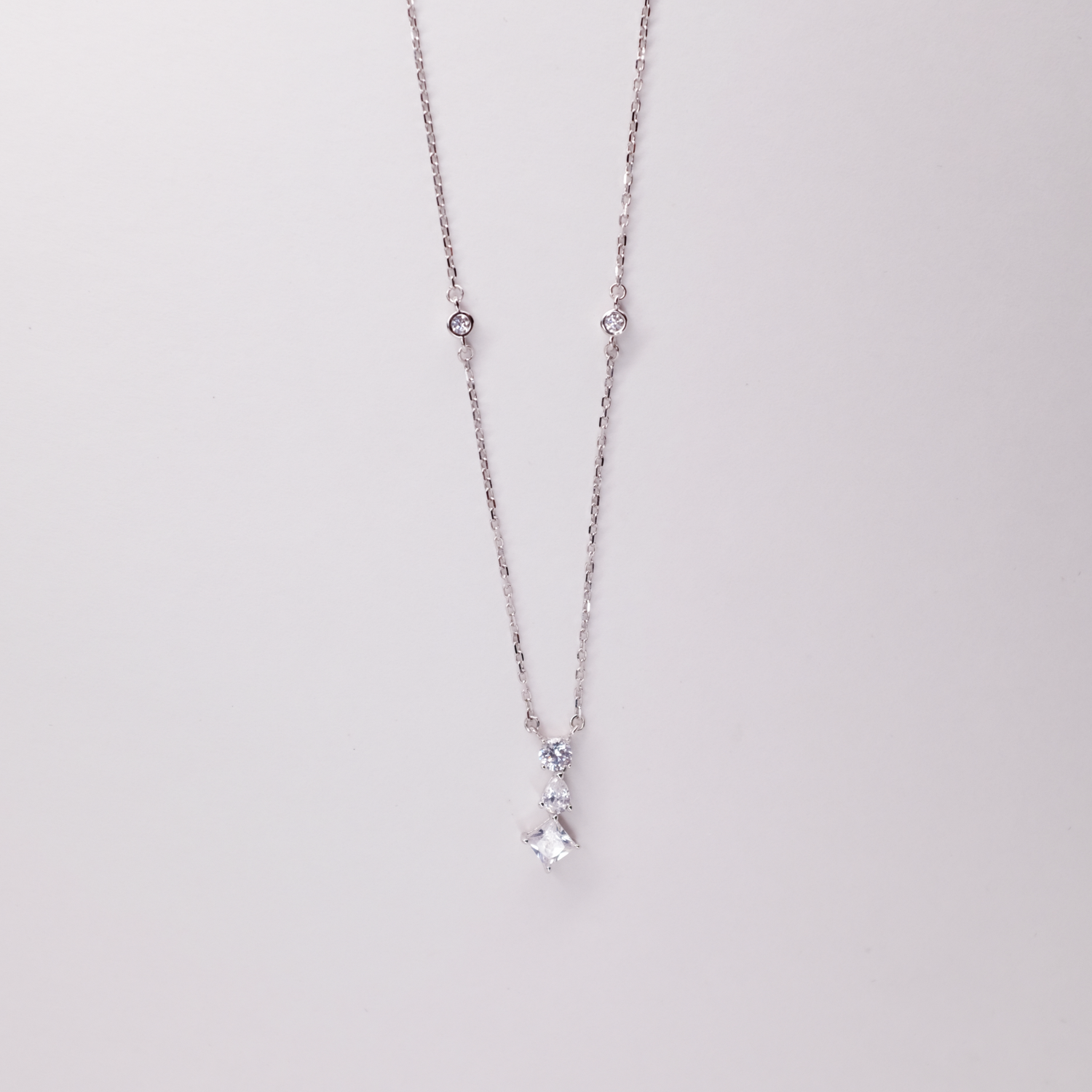 Elegant and refined, the Cascading Trio Necklace features a trio of shimmering stones descending gracefully in a delicate drop design. The refined silver chain is accented with subtle diamond-like details, adding a touch of sophistication. A perfect choice for those who appreciate timeless sparkle with a modern touch.