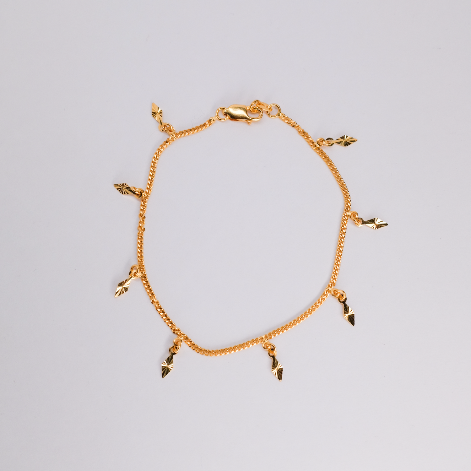 Playful and elegant, this 22K gold charm bracelet features delicate arrow-shaped charms that dangle beautifully along a fine chain. The intricate design adds a touch of movement, making it a unique and stylish addition to any collection.