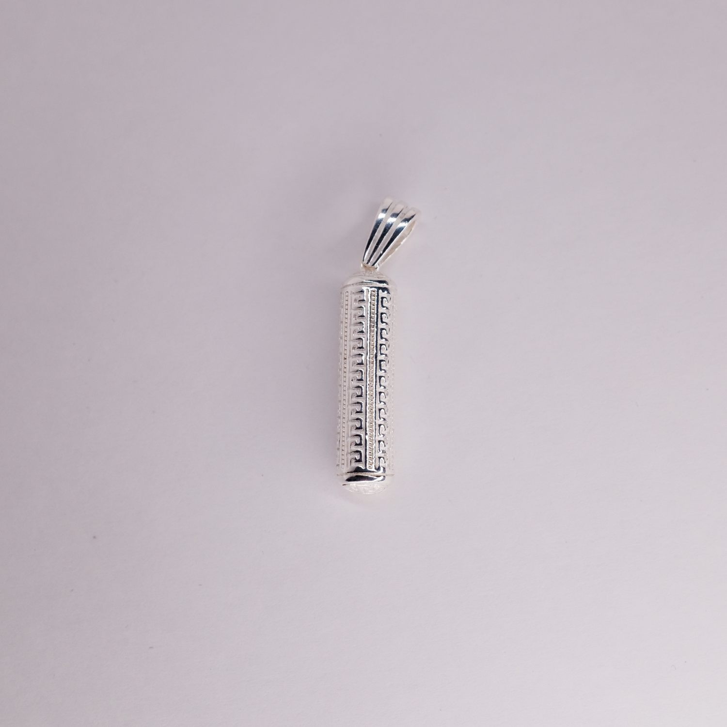 Sleek and distinctive, this silver pendant features a cylindrical scroll shape adorned with intricate engravings, adding depth and character to its minimalist design. A refined yet bold accessory, perfect for those who appreciate understated elegance with a touch of uniqueness.