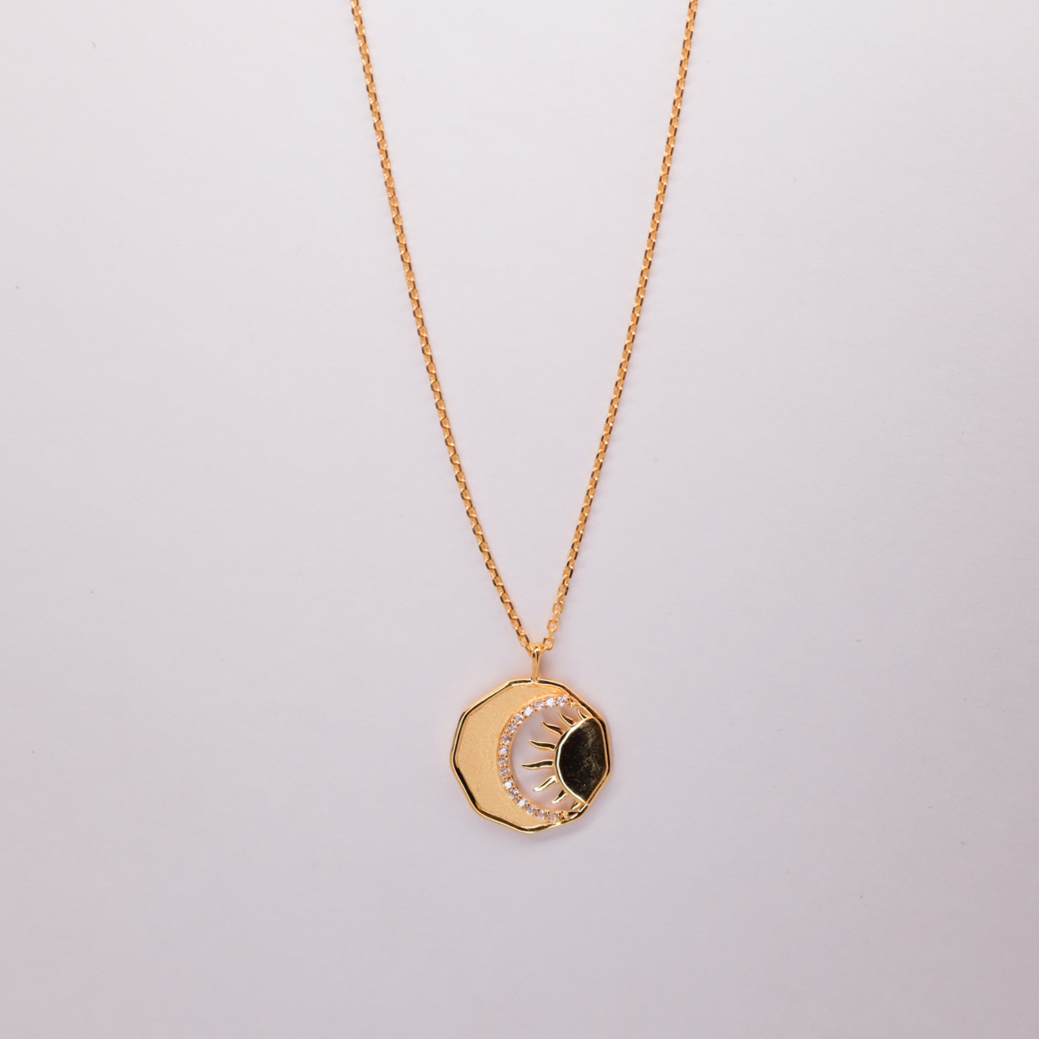 This captivating pendant showcases the celestial dance between the sun and moon, symbolizing balance and transformation. The intricate sunburst detailing is complemented by a sleek moon accent, creating a harmonious blend of light and shadow. A radiant piece designed to add cosmic elegance to your everyday style.