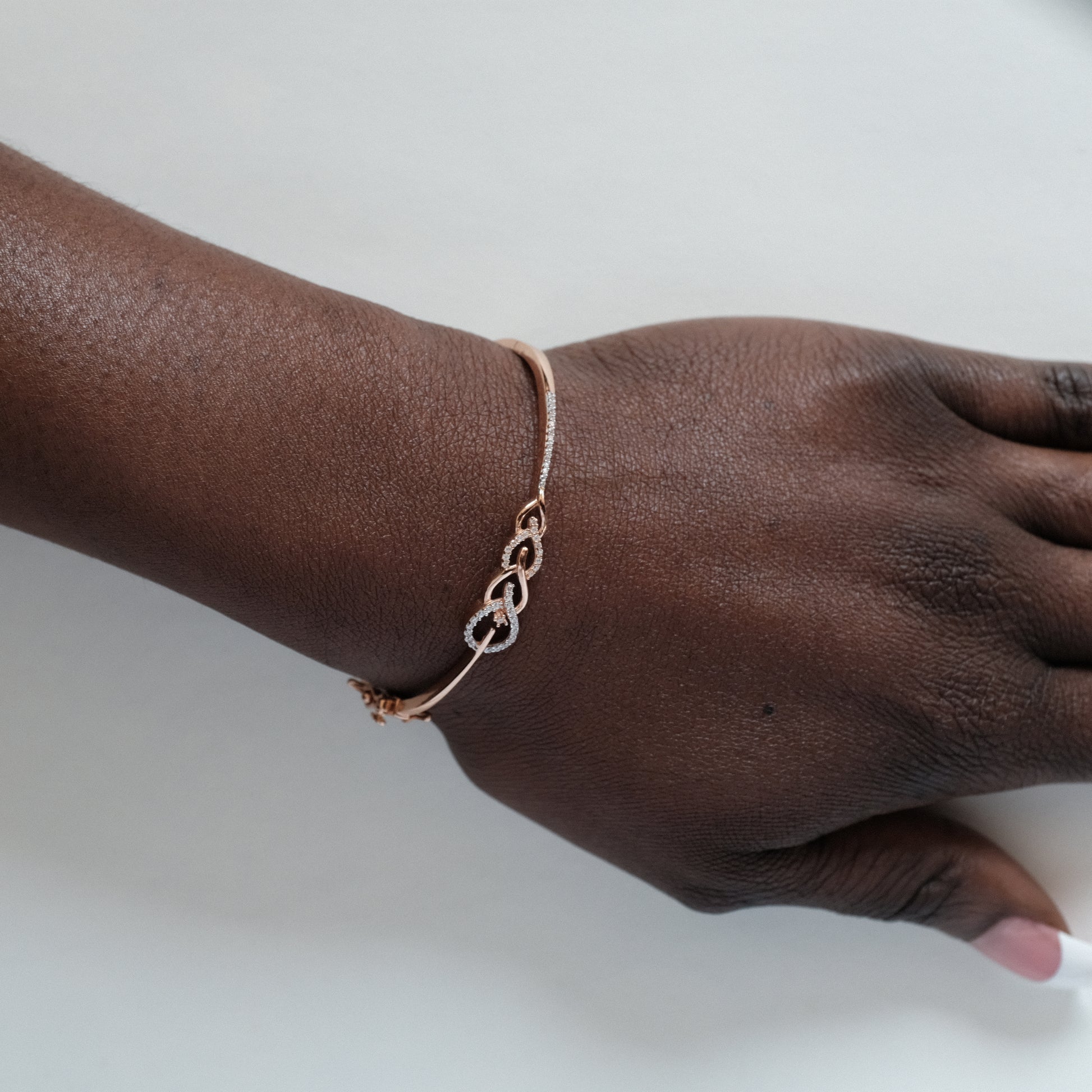 A stunning fusion of elegance and modern design, this rose gold-plated 22k gold bangle features interlocking links adorned with sparkling accents. The delicate yet bold structure symbolizes unbreakable bonds, making it a timeless statement piece for any occasion.