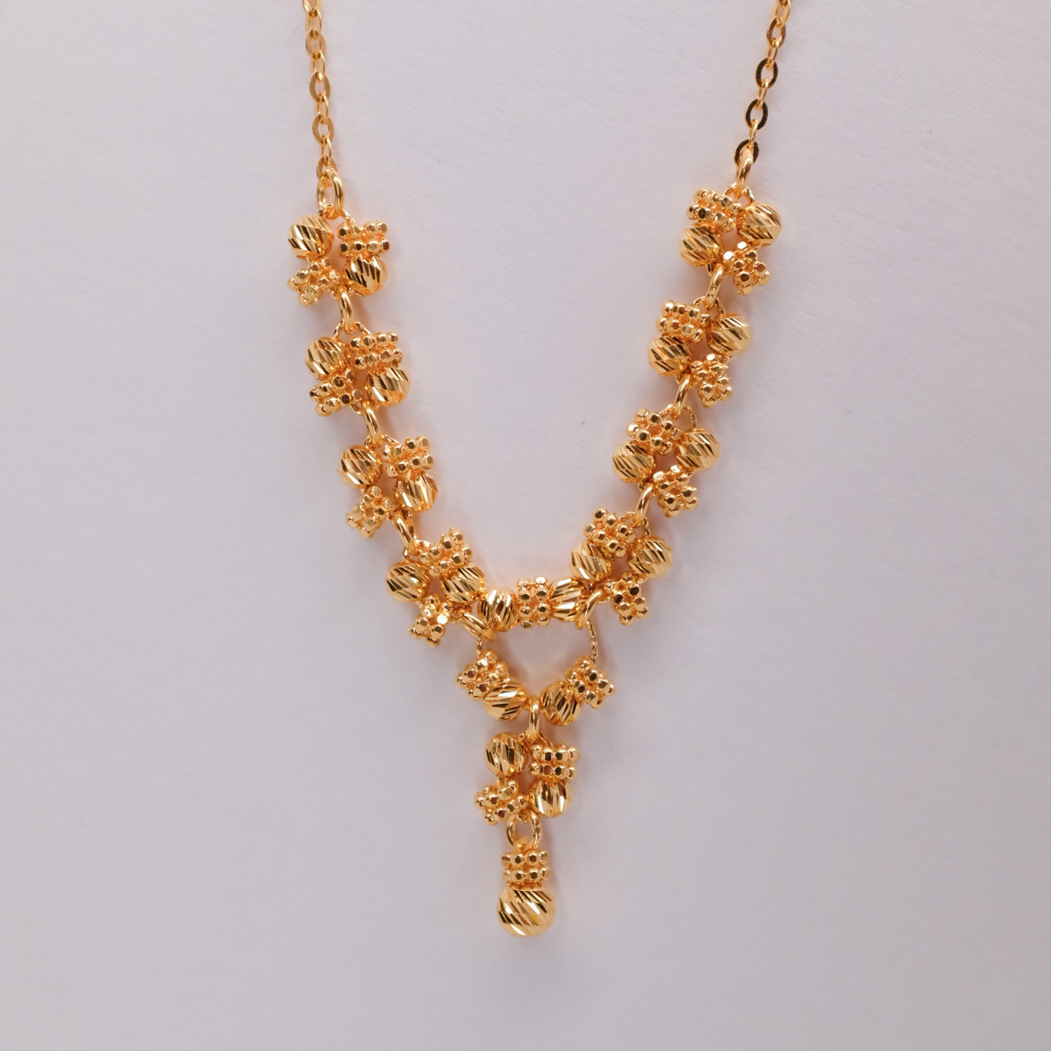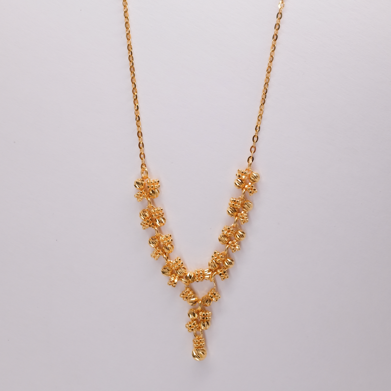 This 22K gold necklace features an elegant arrangement of floral-inspired clusters, creating a graceful cascading effect. Delicately crafted, it adds a touch of timeless beauty and sophistication to any occasion.