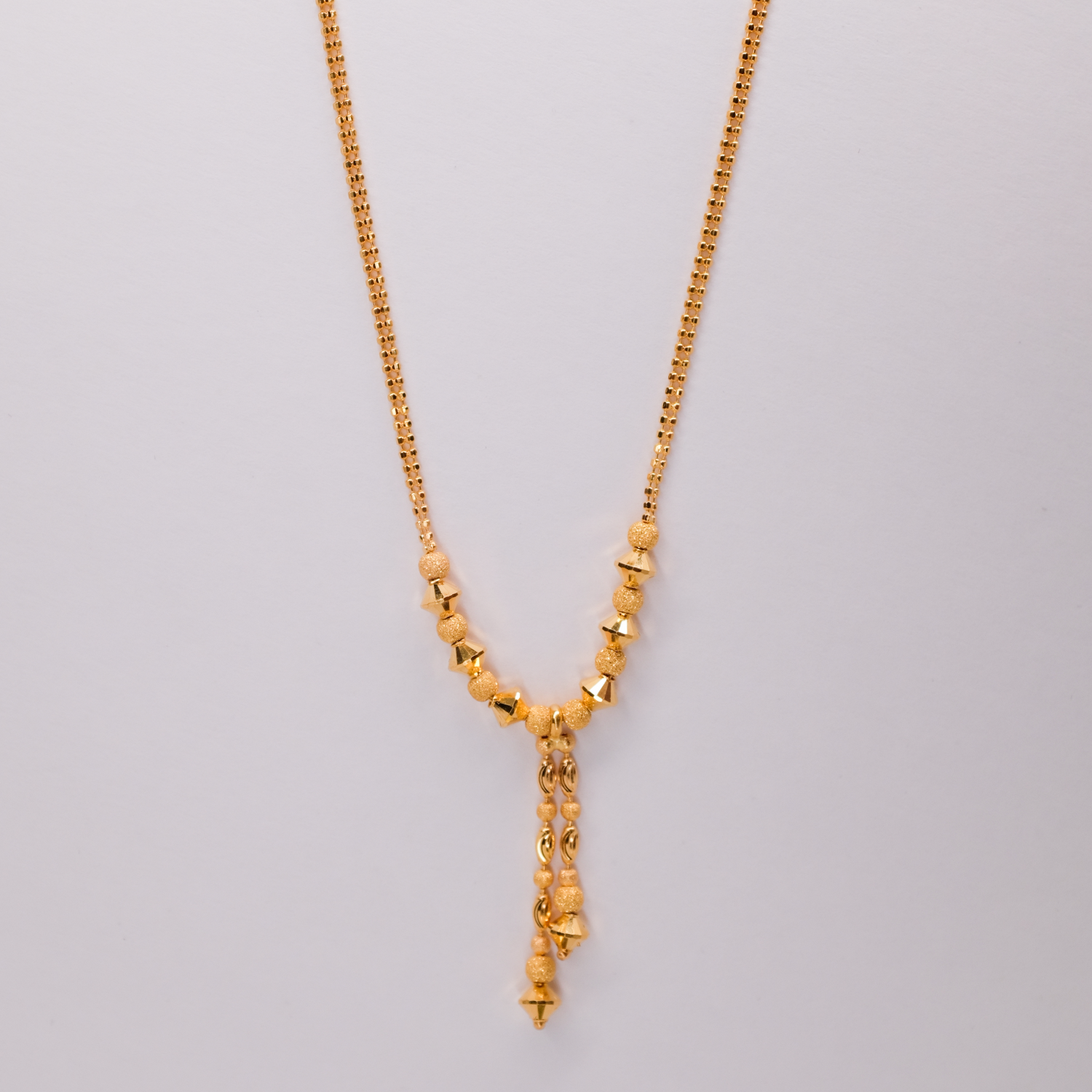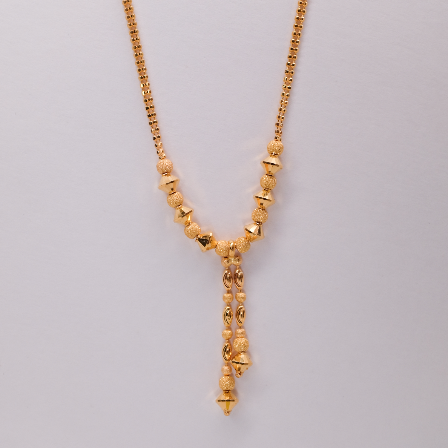 A refined fusion of simplicity and elegance, this 22K gold necklace is adorned with delicate beads leading to a striking drop detail. The perfect blend of tradition and modern charm.
