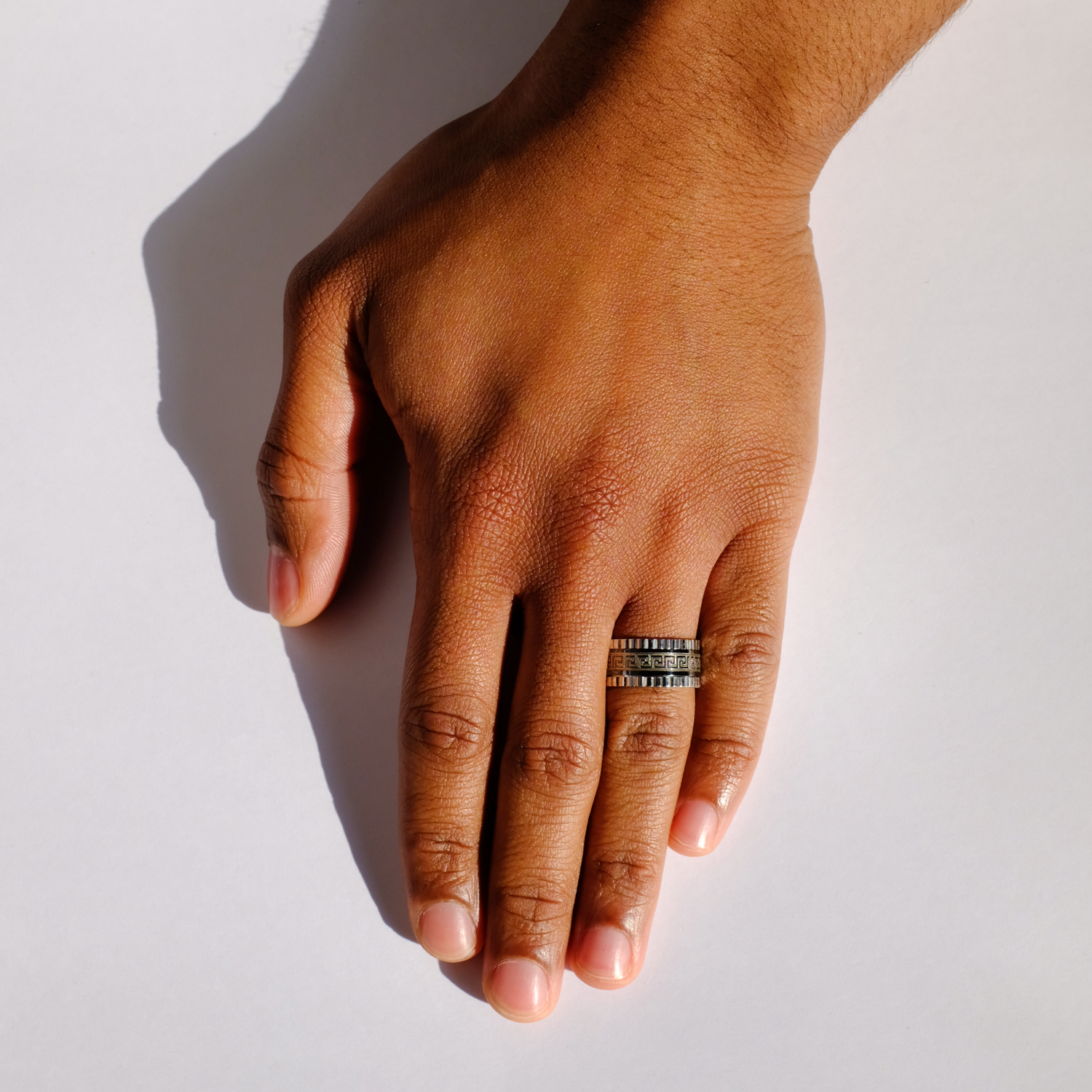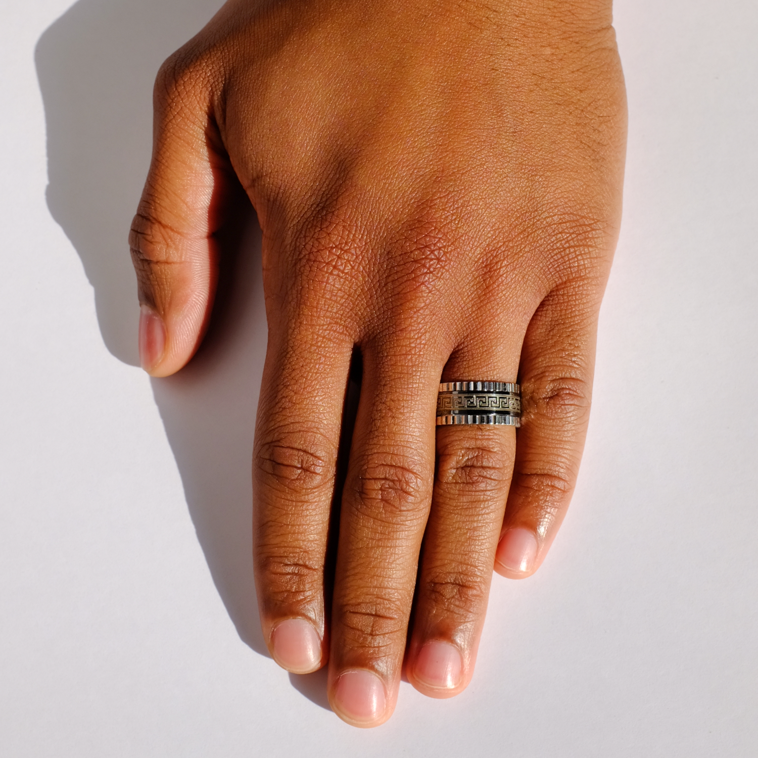 This bold ring showcases a fusion of intricate Greek key patterns and sleek metallic accents, symbolizing strength and timeless elegance. The dual-band design adds depth and character, making it a standout accessory for any modern wardrobe. Crafted for those who appreciate a balance of history and contemporary style, this ring is a statement of power and refinement.