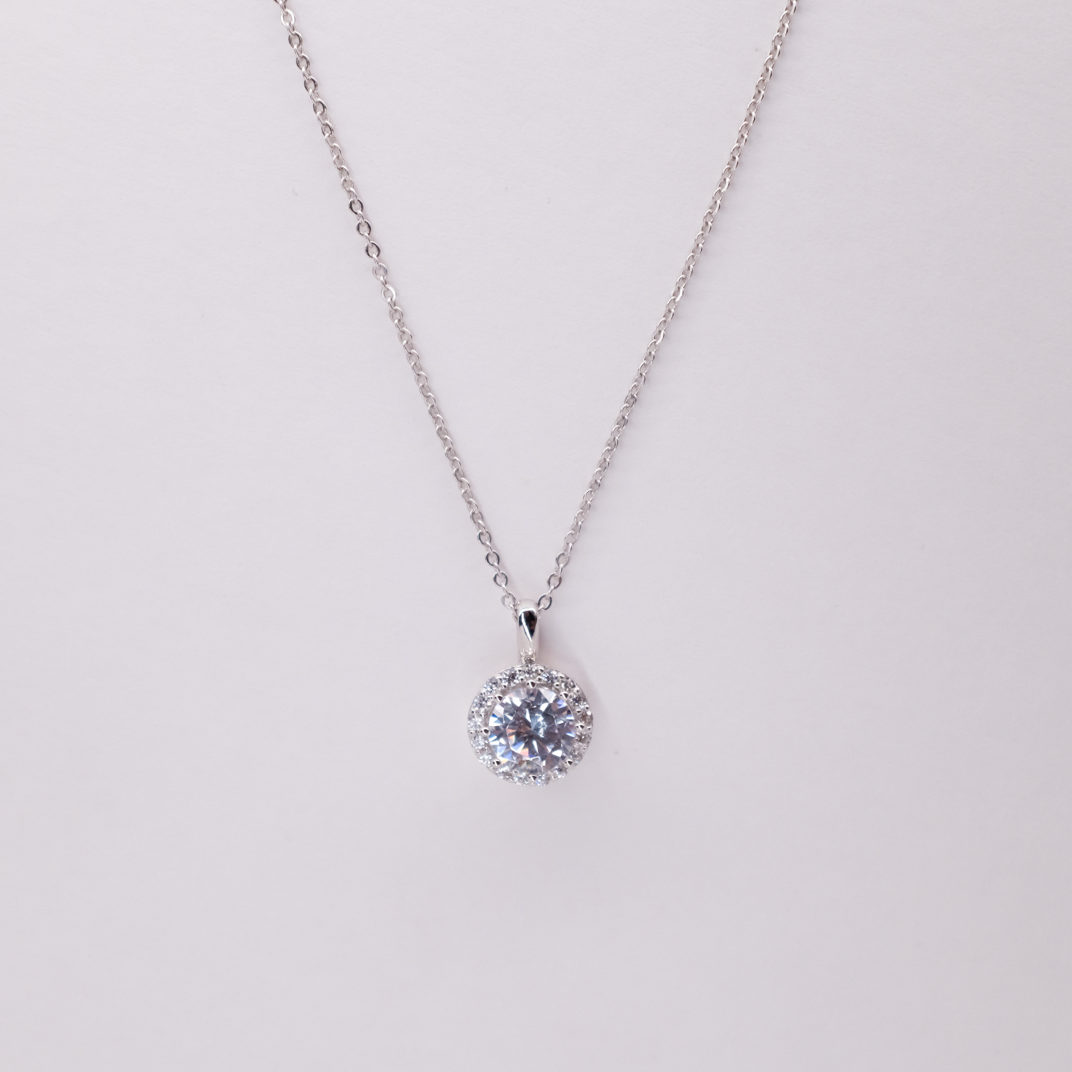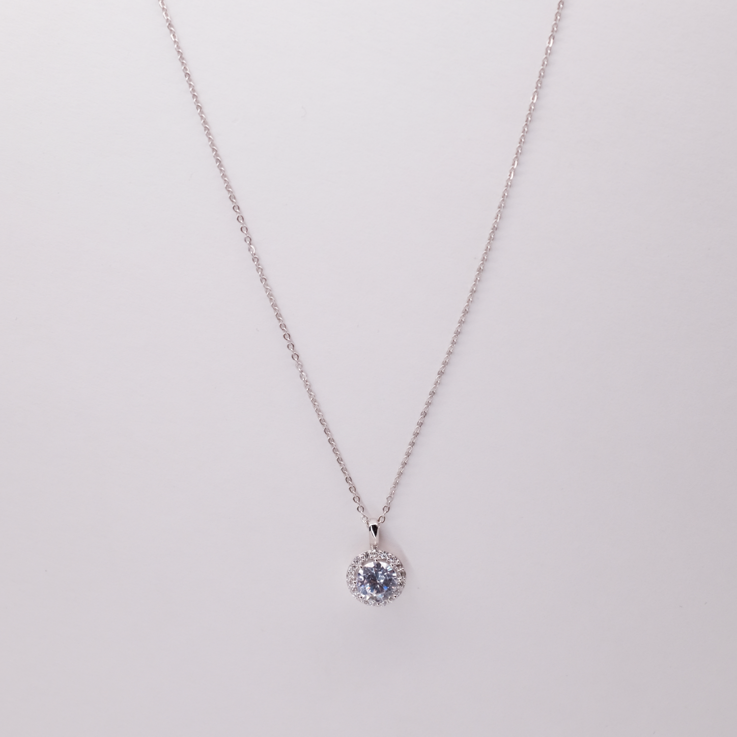 A timeless classic, this necklace features a brilliant round-cut stone encircled by a halo of smaller stones, creating a radiant and eye-catching sparkle. Suspended from a delicate chain, this elegant piece adds a refined touch to any outfit. Perfect for both everyday wear and special occasions, it embodies sophistication and effortless charm.