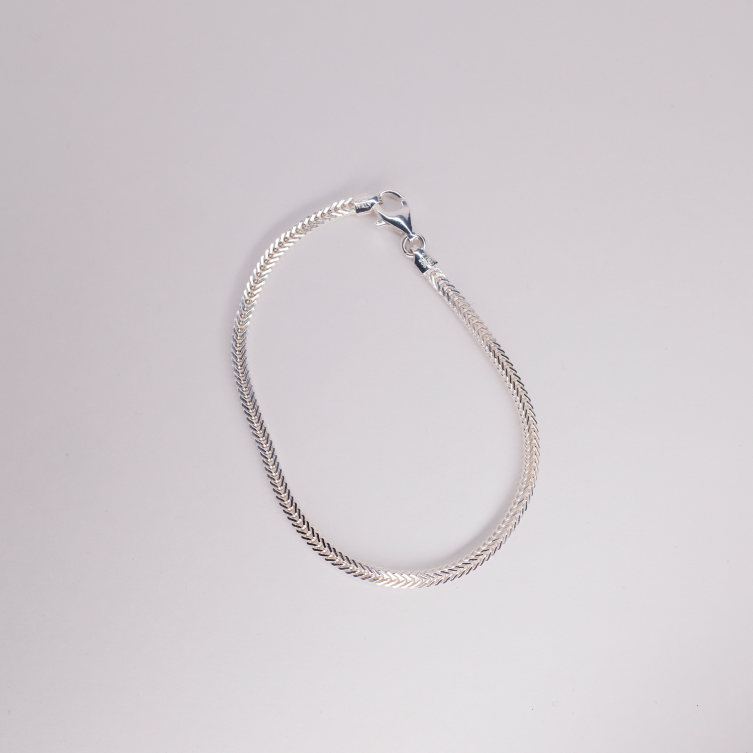 This sleek pure silver bracelet features a classic herringbone design, offering a smooth, fluid drape around the wrist. Its polished finish reflects light beautifully, making it a timeless addition to any jewelry collection. Designed for effortless elegance, it pairs seamlessly with both everyday and formal looks.