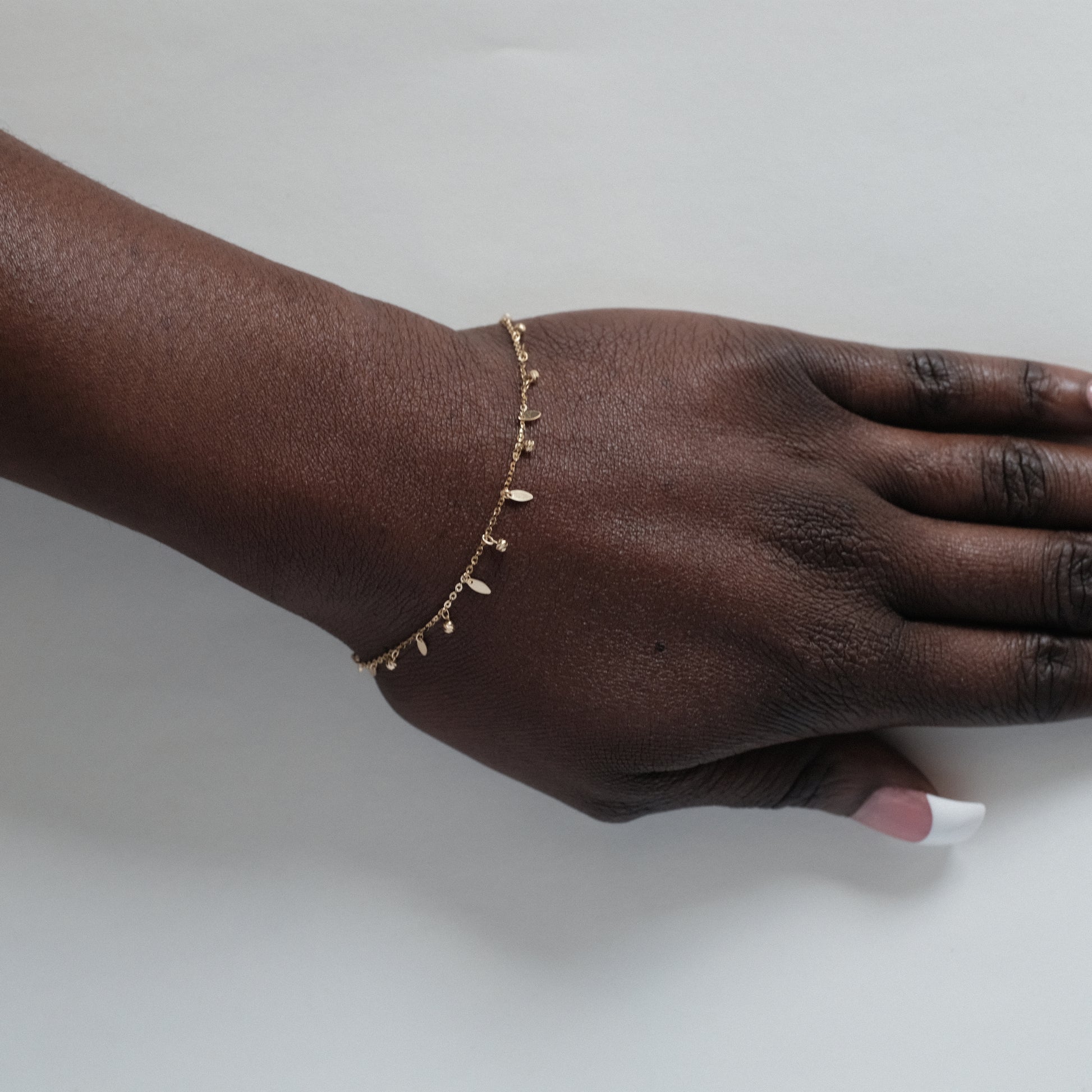 Inspired by nature, this 18K gold bracelet features delicate leaf-shaped accents interspersed with tiny beads. Its organic design adds a graceful and modern touch, perfect for effortless elegance. Whether worn alone or layered, this piece brings a hint of nature’s beauty to any outfit.