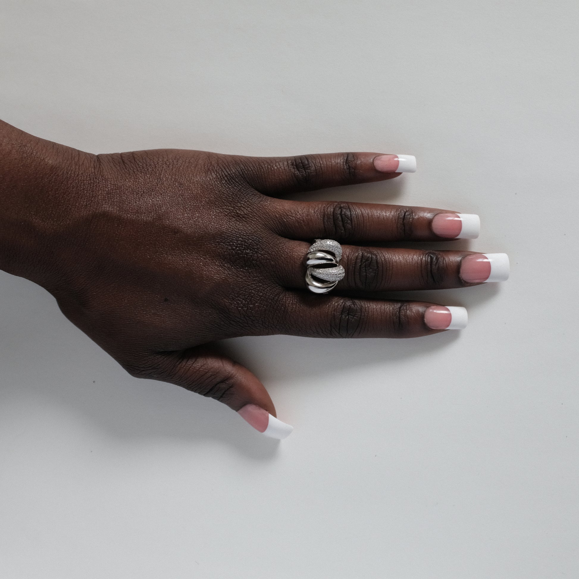 A stunning fusion of elegance and modern artistry, this ring features an intricate crossover design that gracefully intertwines polished metal with pavé-set stones. The fluid curves create a sense of movement, symbolizing unity and timeless sophistication. Perfect for those who appreciate bold statement pieces with a refined touch.