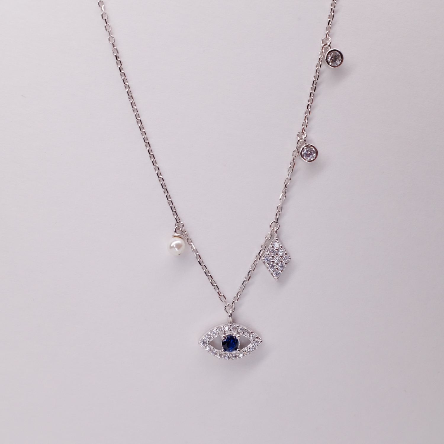 A captivating fusion of symbolism and elegance, this necklace features an enchanting blue eye pendant, accented with delicate charms including a pearl, a pavé leaf, and shimmering stones. The asymmetrical design adds a modern, playful touch, making it a unique statement piece. Perfect for layering or wearing alone for a hint of intrigue.
