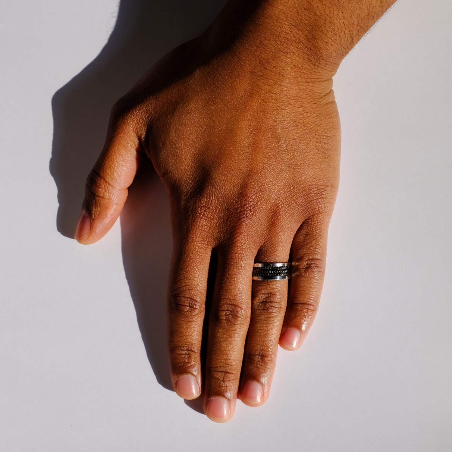 A sleek yet rugged design, this ring features a dark, textured surface with a modern industrial edge. The contrast of polished metal edges against the black patterned core adds depth and sophistication. Perfect for those who appreciate bold minimalism with a touch of mystery, this band is a statement of strength and refinement.