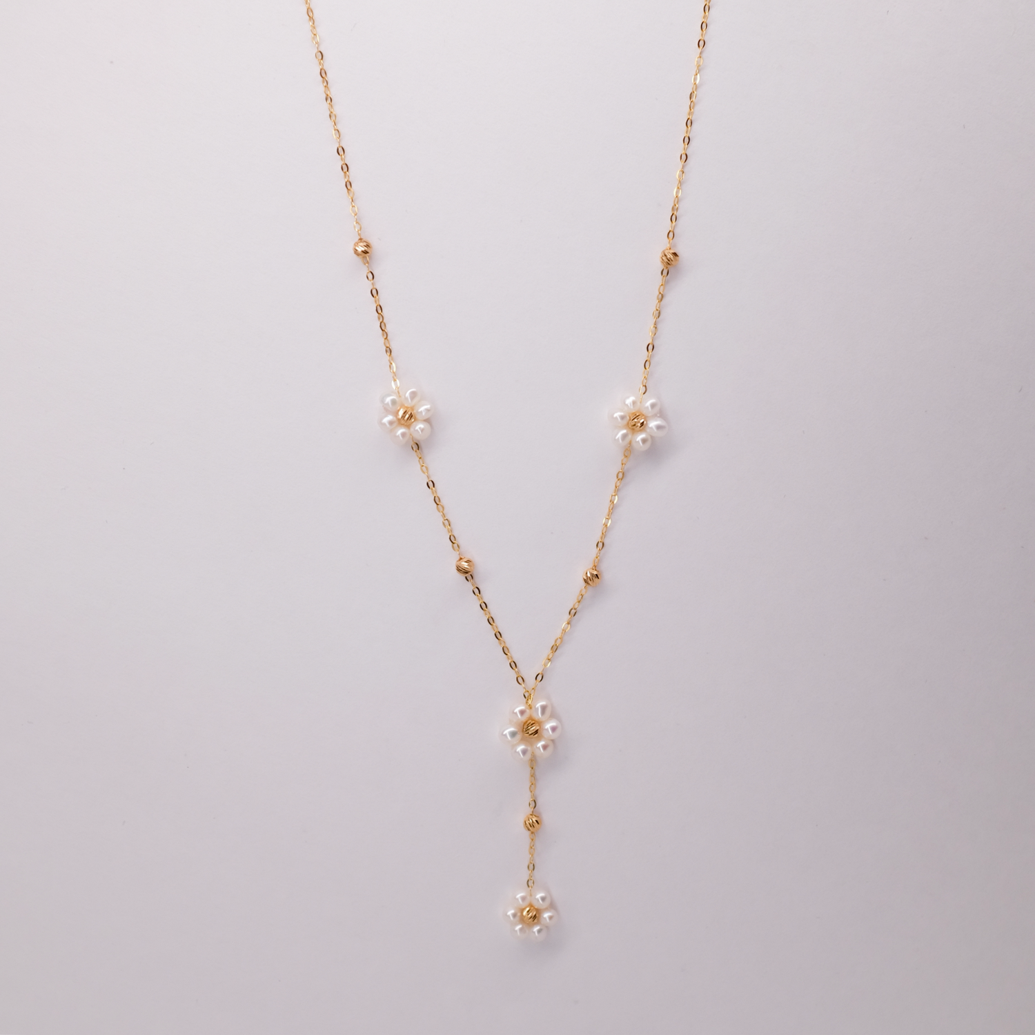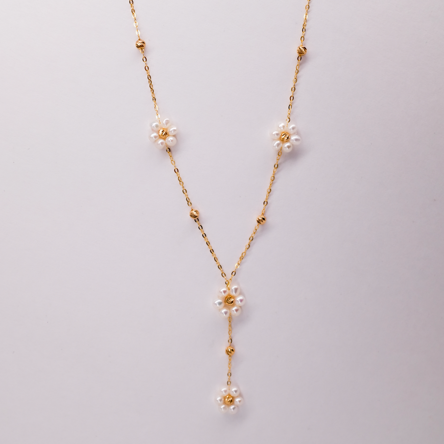 Graceful and refined, this 22K gold Y-necklace features delicate pearl-adorned floral motifs, creating a soft, feminine elegance. The cascading drop detail adds movement and charm, making it a perfect statement piece for any occasion. A timeless blend of sophistication and nature-inspired beauty.