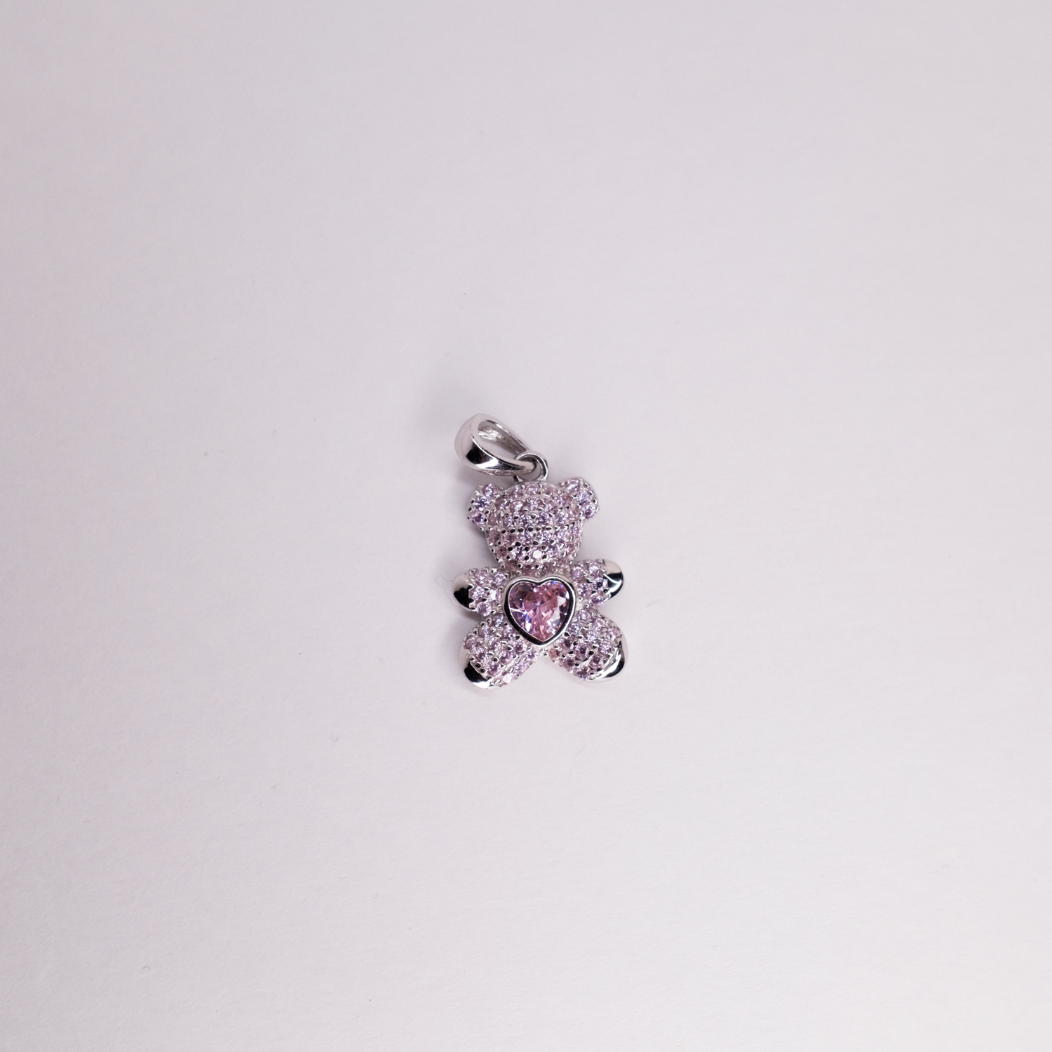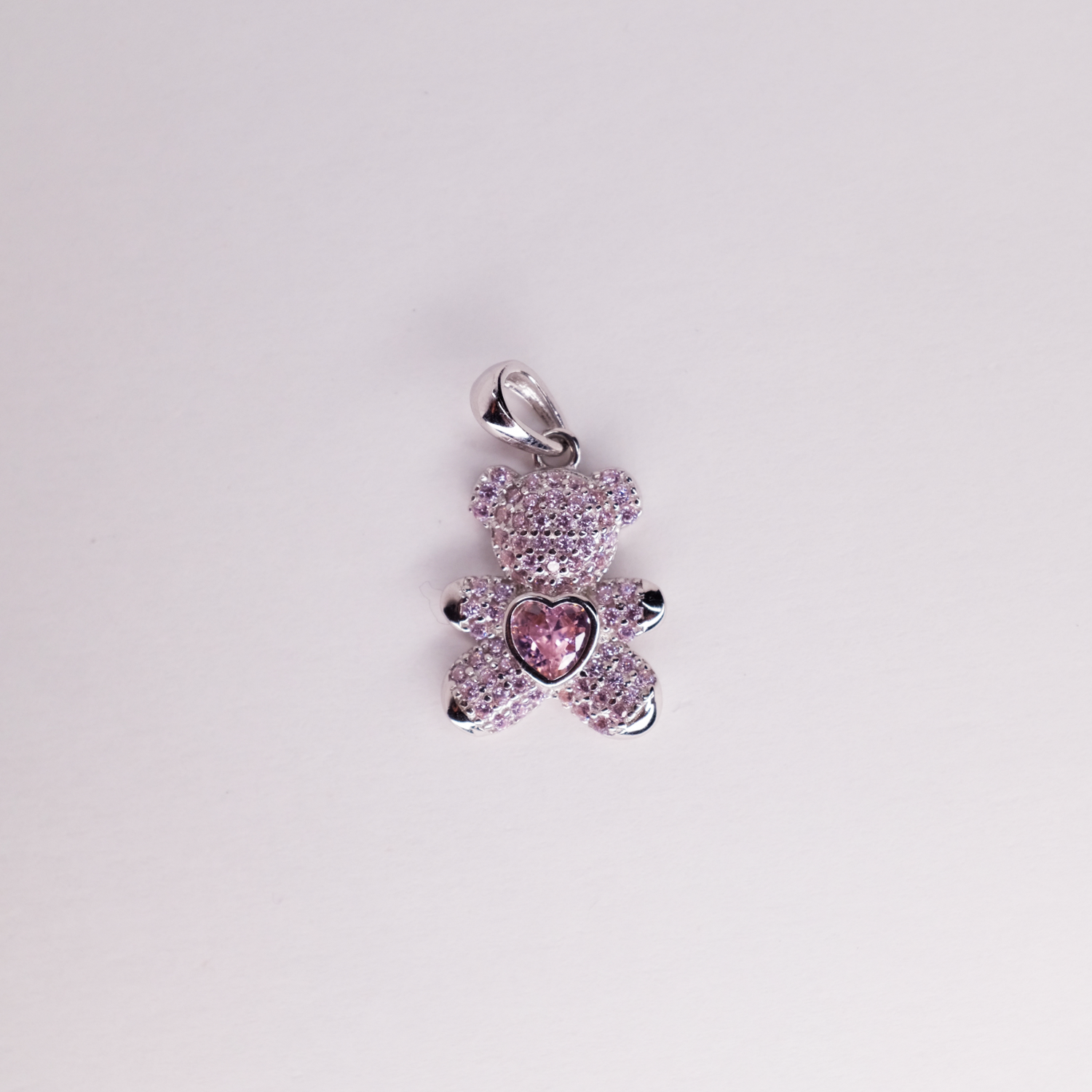 Playful and charming, this pure silver teddy bear pendant sparkles with dazzling pink stones, capturing the essence of childhood nostalgia. A heart-shaped gem at its center adds a touch of warmth and affection, making it a perfect keepsake or a sweet gift for someone special. Delightful and whimsical, it’s a timeless symbol of love and comfort.