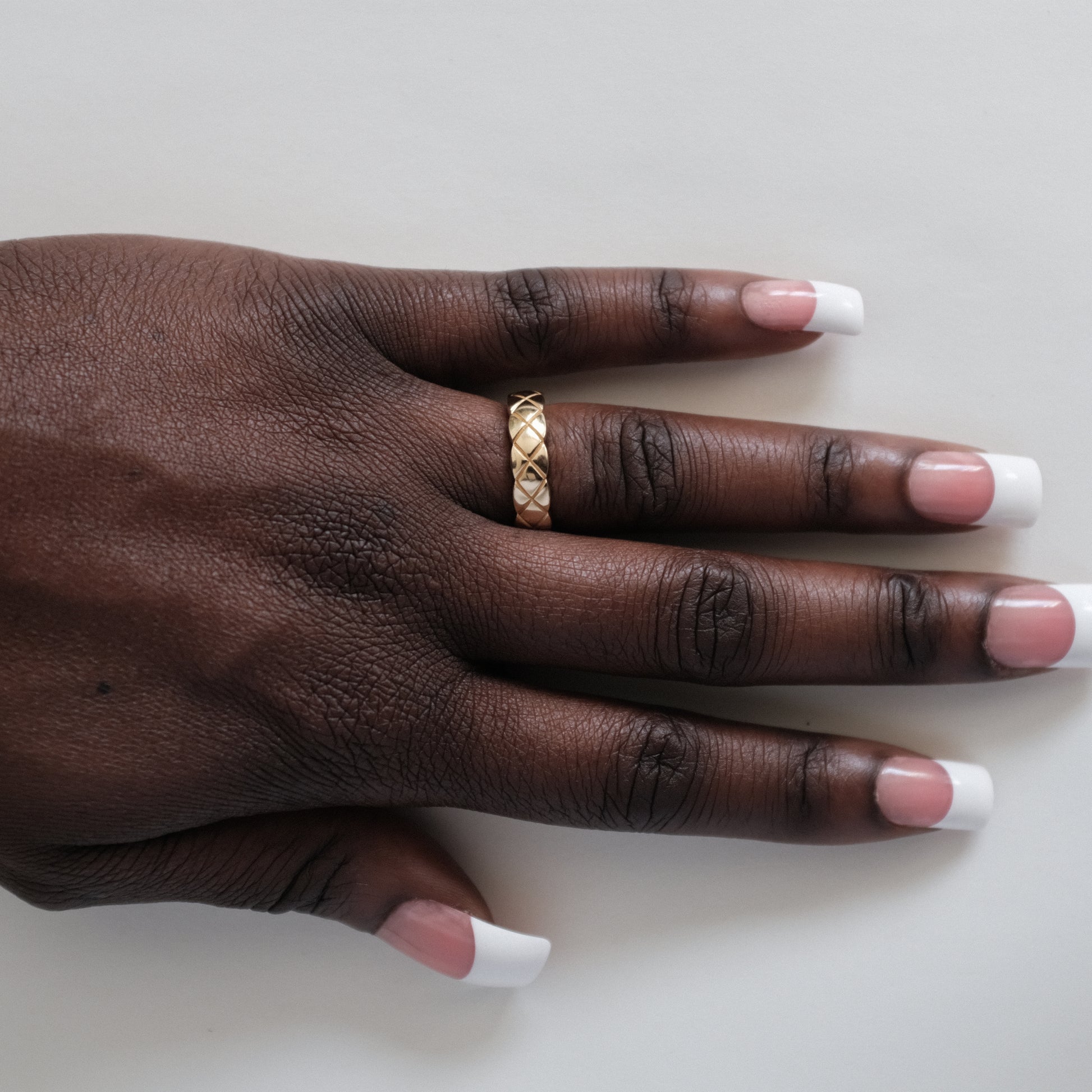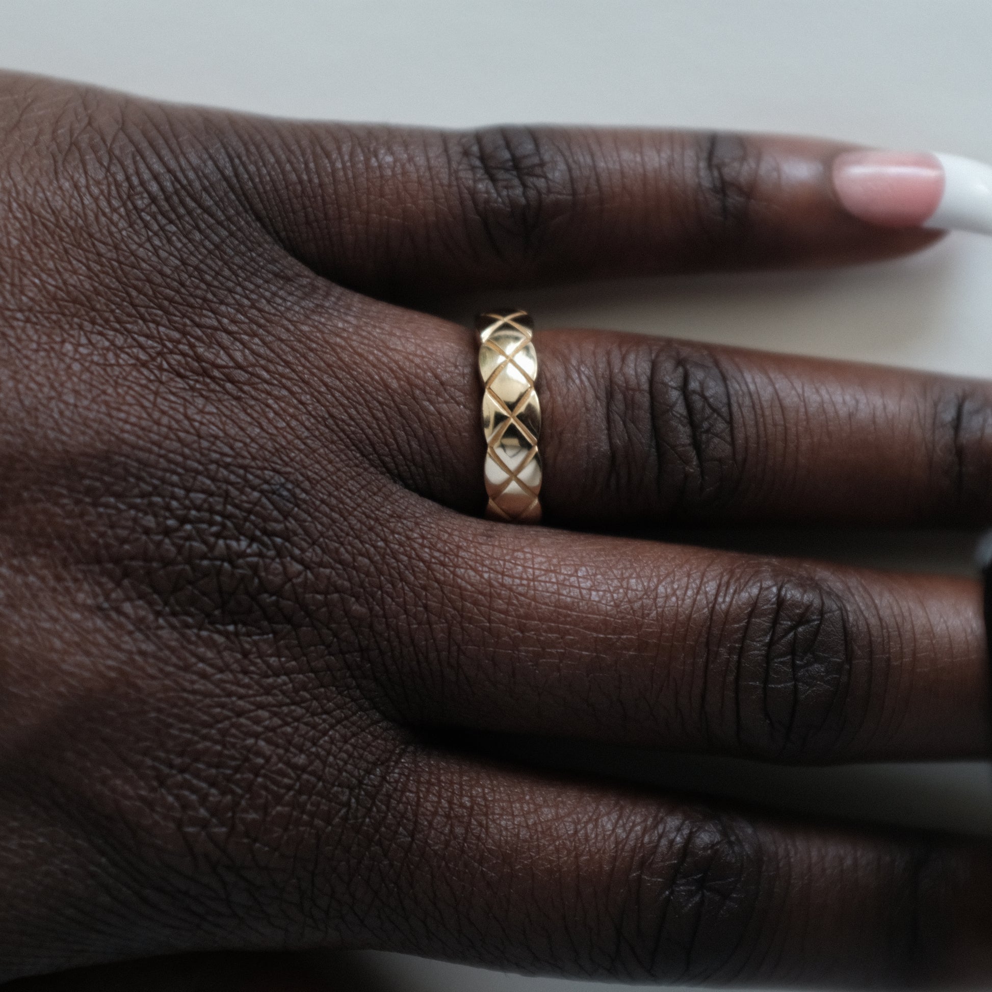 Sleek and sophisticated, this 18K gold quilted dome ring features a beautifully textured design reminiscent of classic luxury. Its smooth, rounded shape offers a bold yet refined look, perfect for everyday elegance. Whether worn alone or stacked, this piece brings timeless charm to any collection.