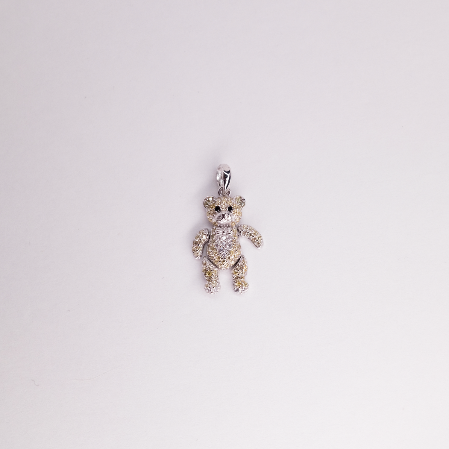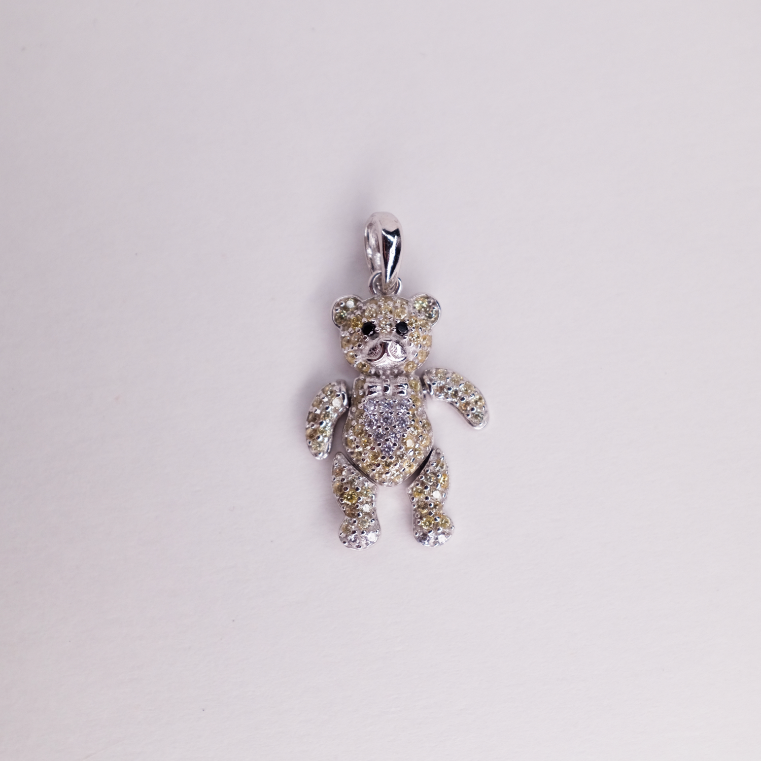 A playful yet elegant charm, this pure silver teddy bear pendant is encrusted with shimmering stones for a dazzling finish. Its endearing design and intricate detailing make it a sweet and stylish accessory, perfect for adding a touch of whimsy to any look.