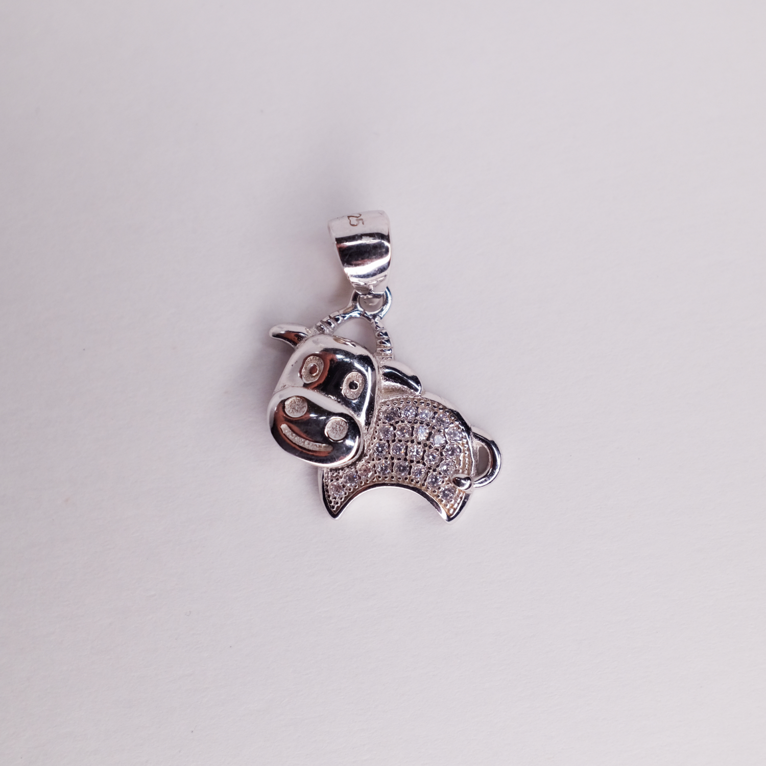 This adorable pure silver cow pendant is a playful blend of charm and shimmer. Its finely detailed design is accented with sparkling stones, capturing the joyful and gentle nature of this beloved animal. A fun and unique piece for any collection.
